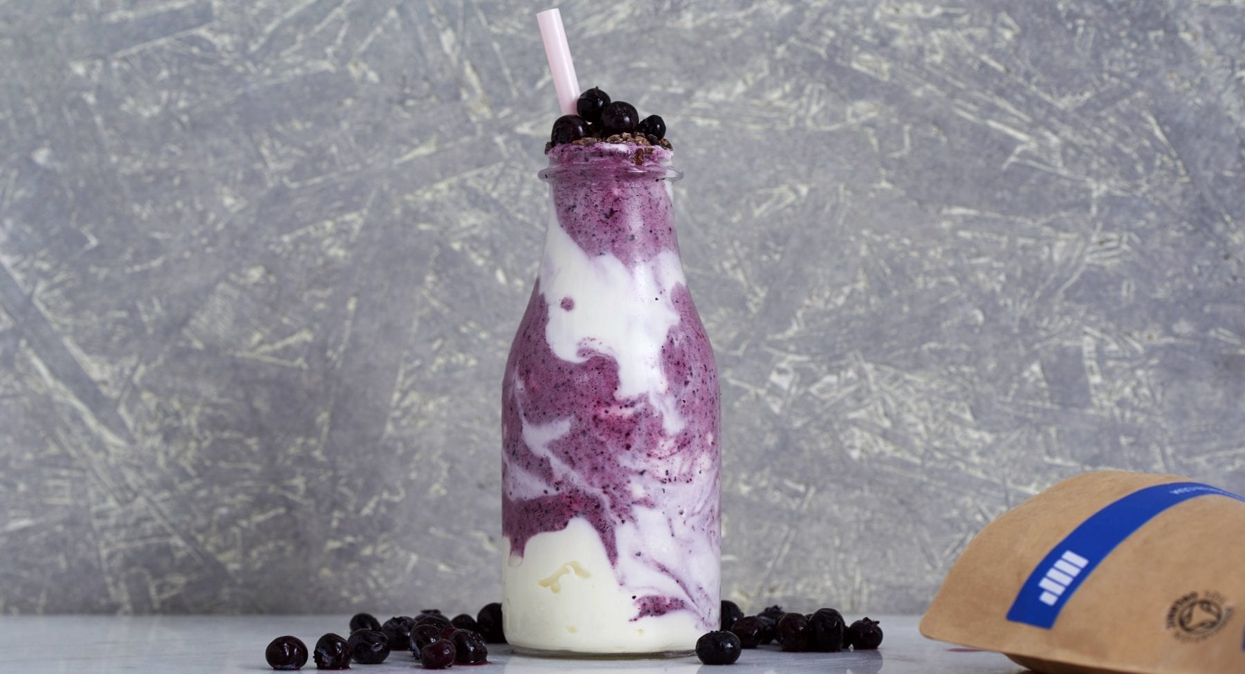 - Mische in einem Mixer die Blaubeeren, das Proteinpulver und die Milch zusammen, fülle dies in ein Glas.
