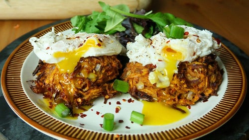 Diese Süßkartoffel-Röstis sind außen golden und knusprig, in der Mitte weich und mit einem goldgelben Eigelb versehen.
