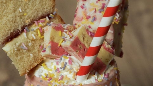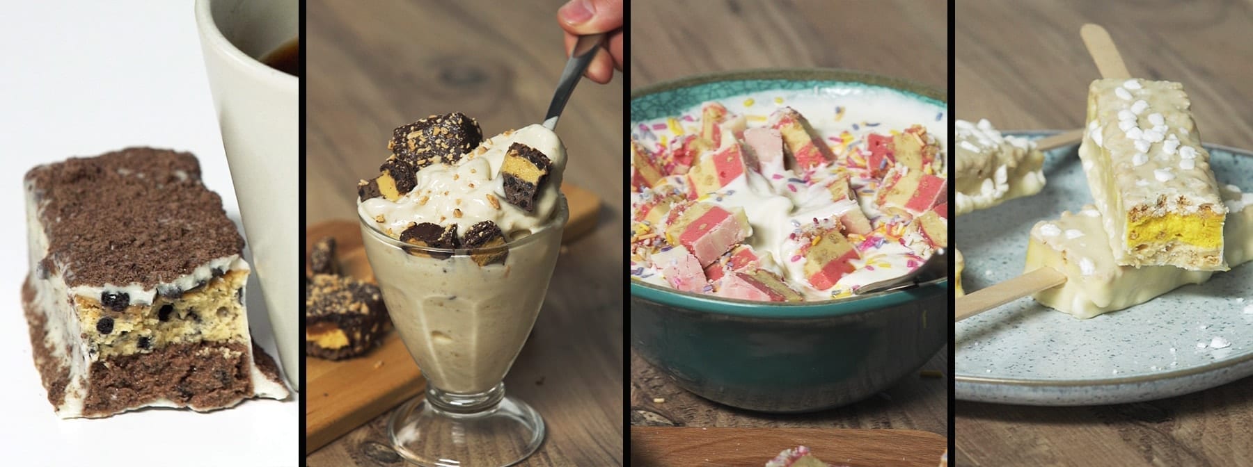 - Baue deinen Sundae, indem du den Eis-Mix in ein Glas gibst und mit den 6 Layer Stückchen dekorierst.