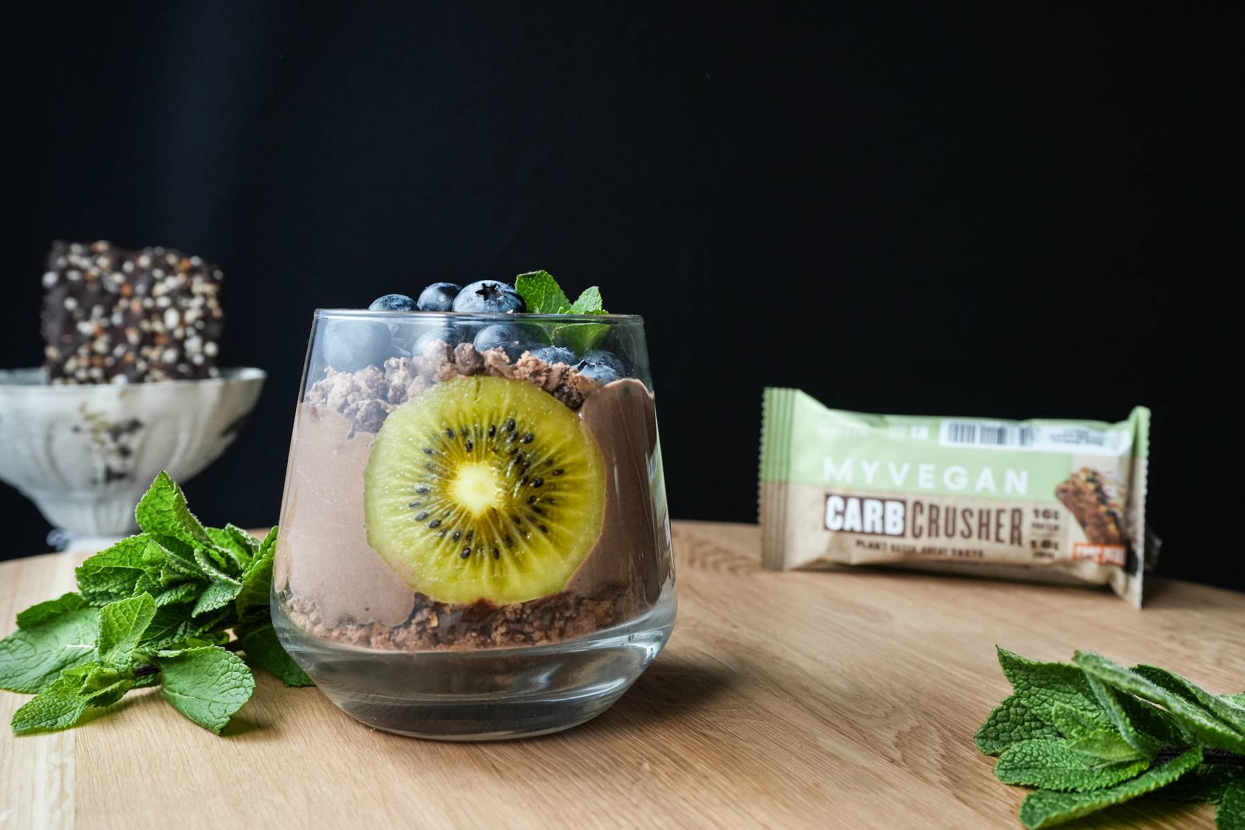 Gib nun die Avocado Creme darüber und dekoriere das Dessert abschließend mit Minze, Heidelbeeren und Kiwi. Guten Appetit!