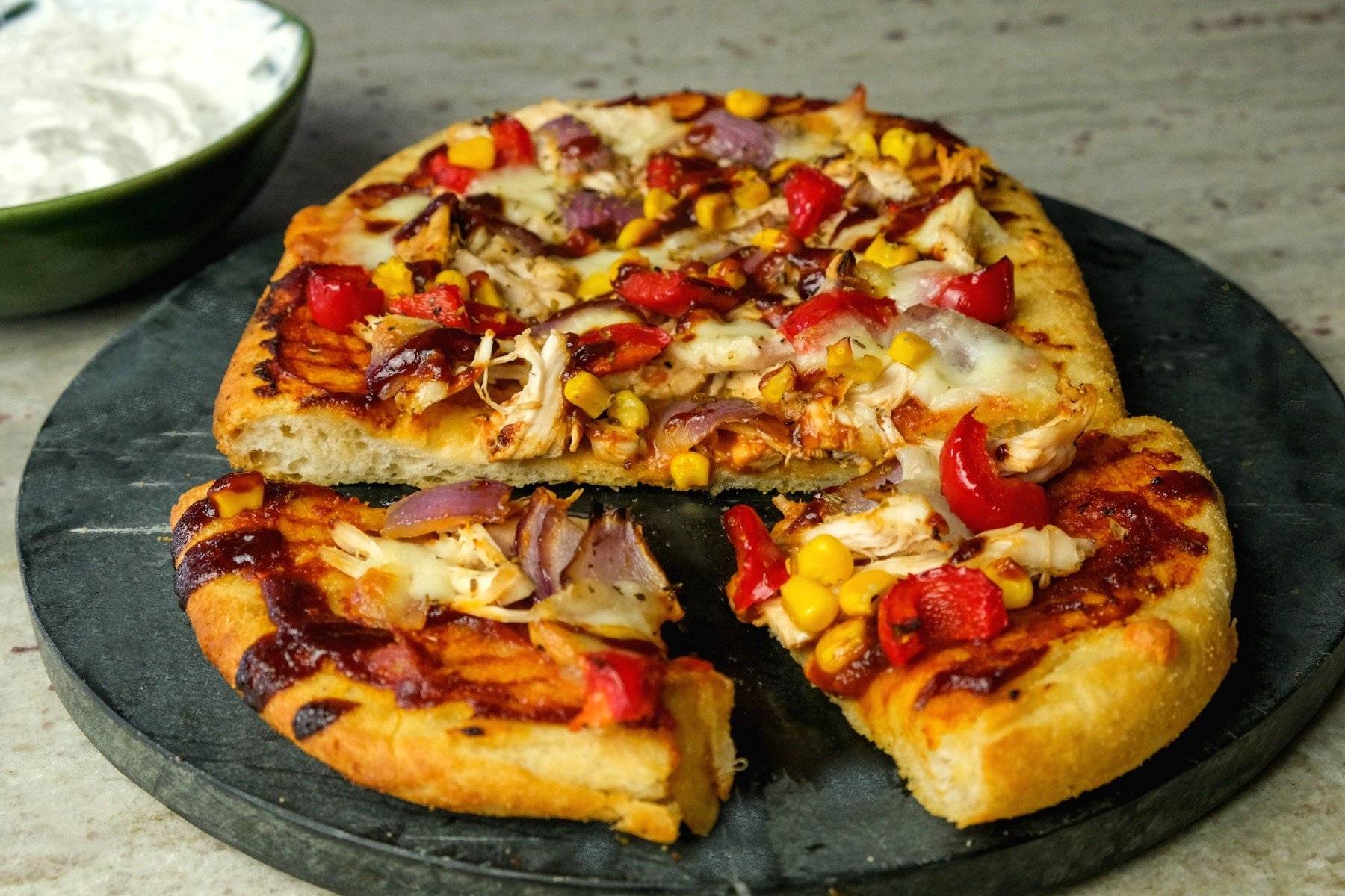 BBQ Hähnchen Pizza mit Knoblauch & Kräuter Dip