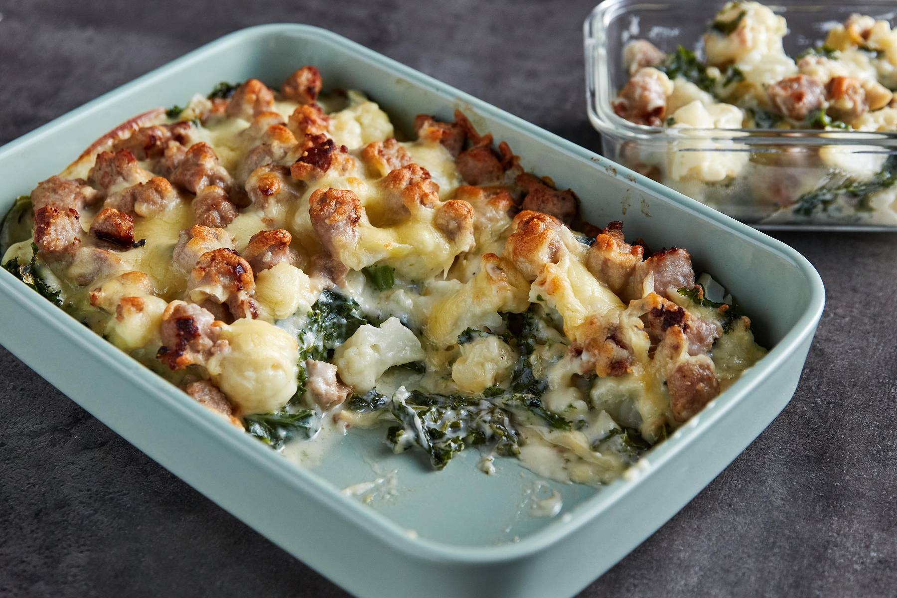 Wir haben den Blumenkohl Käse Auflauf, der wohl eine der besten Beilagen überhaupt ist, mit zusätzlichen Protein und nahrhaftem Grünkohl zum Hauptgericht gemacht. Das Ergebnis ist vollmundig, cremig und definitiv sättigend.