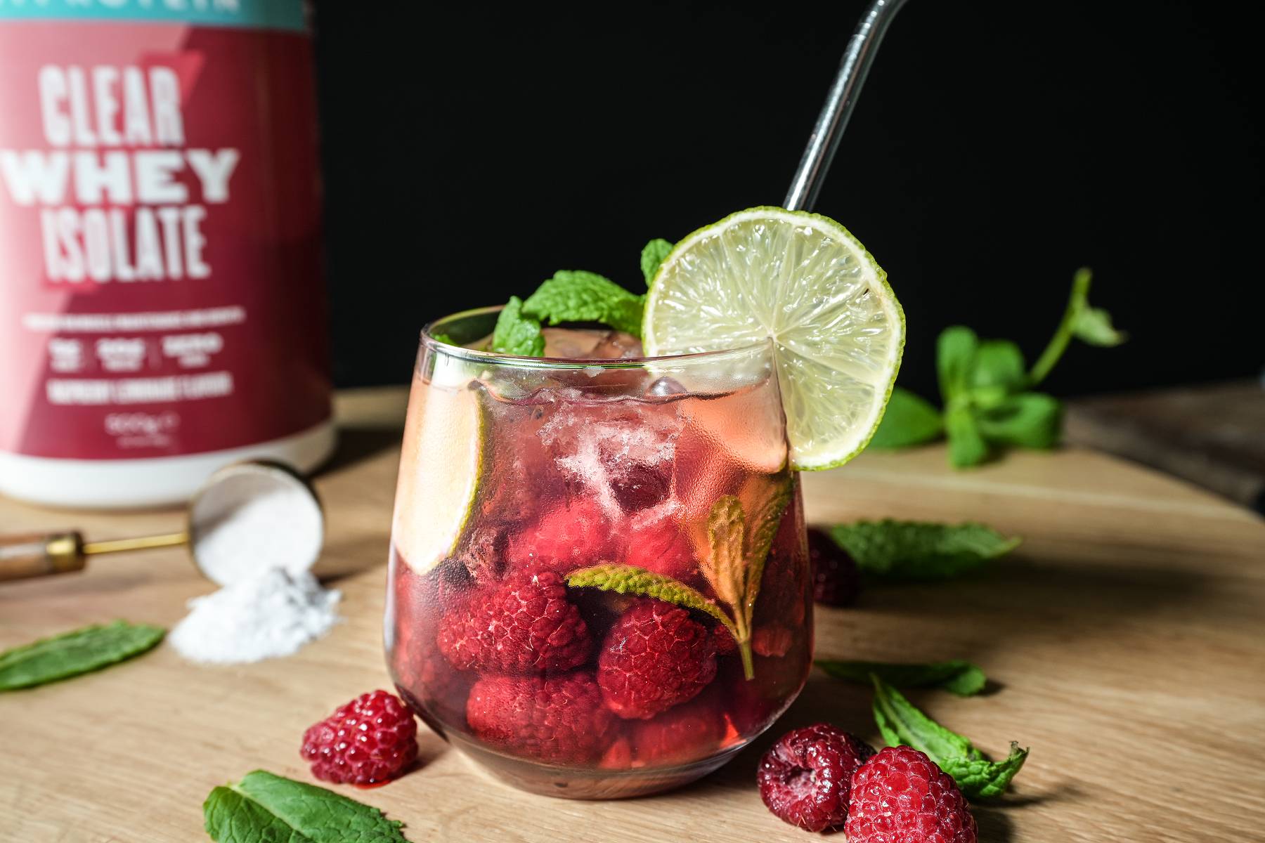 Gib die Himbeeren, Limettenscheiben und frische Minze hinzu.