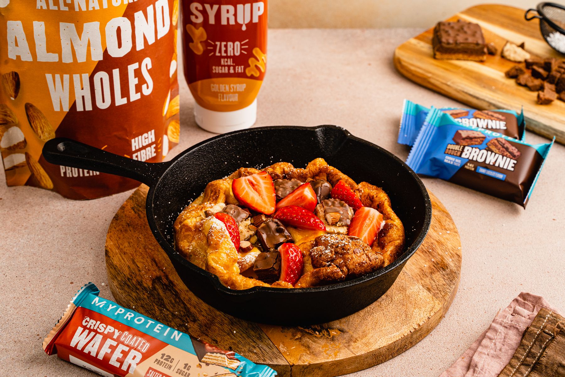 Serviere den Ofenpannkuchen zusammen mit deine Lieblingstoppings (wir haben uns für Wafer, Brownie, Erdbeeren, Nüsse, Joghurt und zuckerfreien Sirup entschieden).