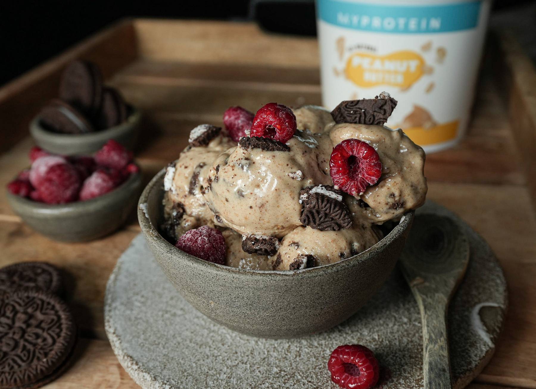 Hebe nun die Oreo Kekse unter und serviere die Nicecream mit Oreo Keksen und gefrorenen Himbeeren. Bon Appetit!