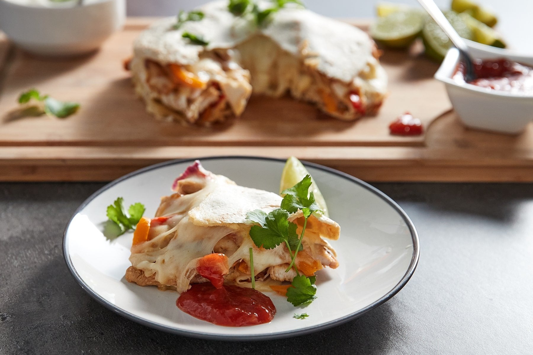 Wiederhole den Vorgang noch zweimal, bis das Hähnchen und Käse aufgebraucht sind – und lege dann einen letzten Wrap oben drauf. Drücke die Fajita-Schichten mit den Händen fest an und decke dann die Backform mit Alufolie ab. Backe den Fajita-Kuchen für 15-20 Minuten im Ofen.