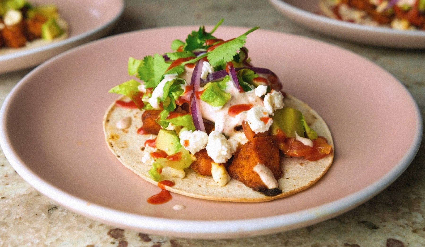 Mit gebackenen Süßkartoffeln, zerbröseltem Feta, würziger Salsa und einer Chilli-Zitronen Sauerrahm. Diese weichen Tacos sind eine wahre Geschmacksexplosion, die darauf wartet, probiert zu werden.