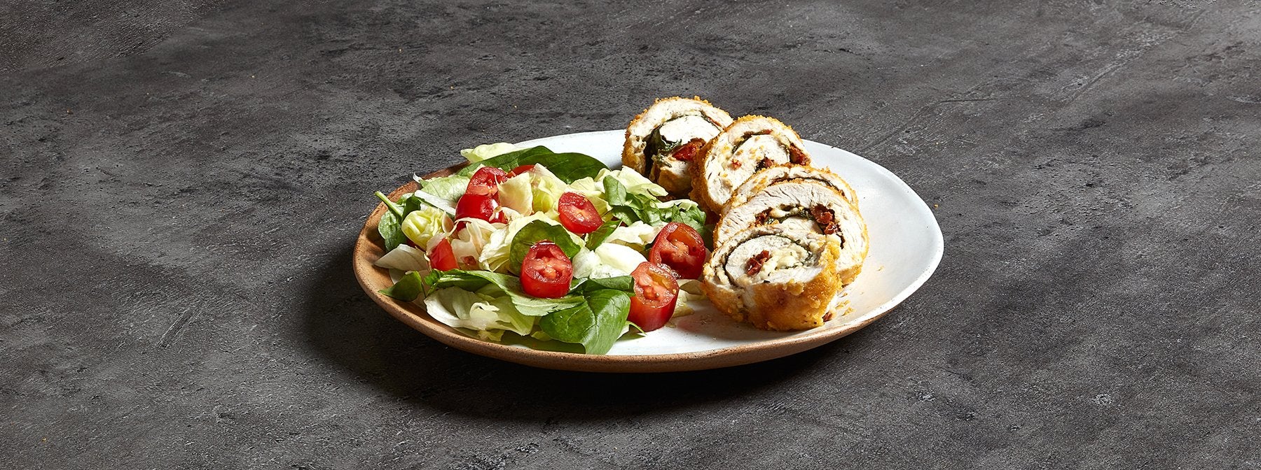 Die Hähnchen-Rouladen in den goldgelben Semmelbröseln wälzen, mit etwas kalorienarmem Kochspray besprühen und dann auf ein mit Backpapier ausgelegtes Backblech legen. 35 Minuten lang backen, bis sie vollständig durchgegart sind.