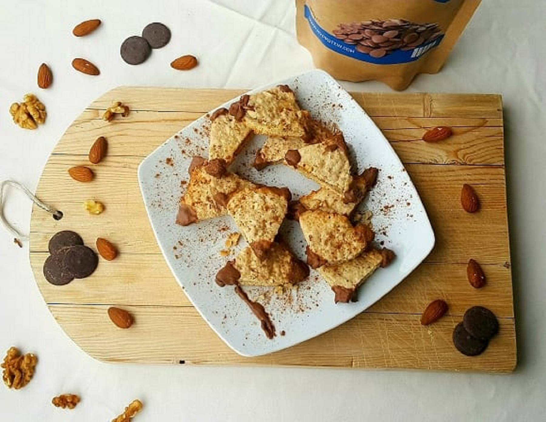 - Schneide jetzt kleine Dreiecke aus dem Teig, tunke die Ecken in die Schokolade und warte noch kurz bis diese fest wird. Zum Schluss kannst du noch etwas Zimt über die Nussecken geben.