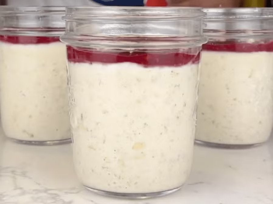 Gib zuerst die Haferflocken, den griechischen Joghurt, die Milch, den Frischkäse, den Vanille-Extrakt, den Süßstoff, das Proteinpulver und die Prise Salz in ein Glas und verrühre alles sorgfältig.