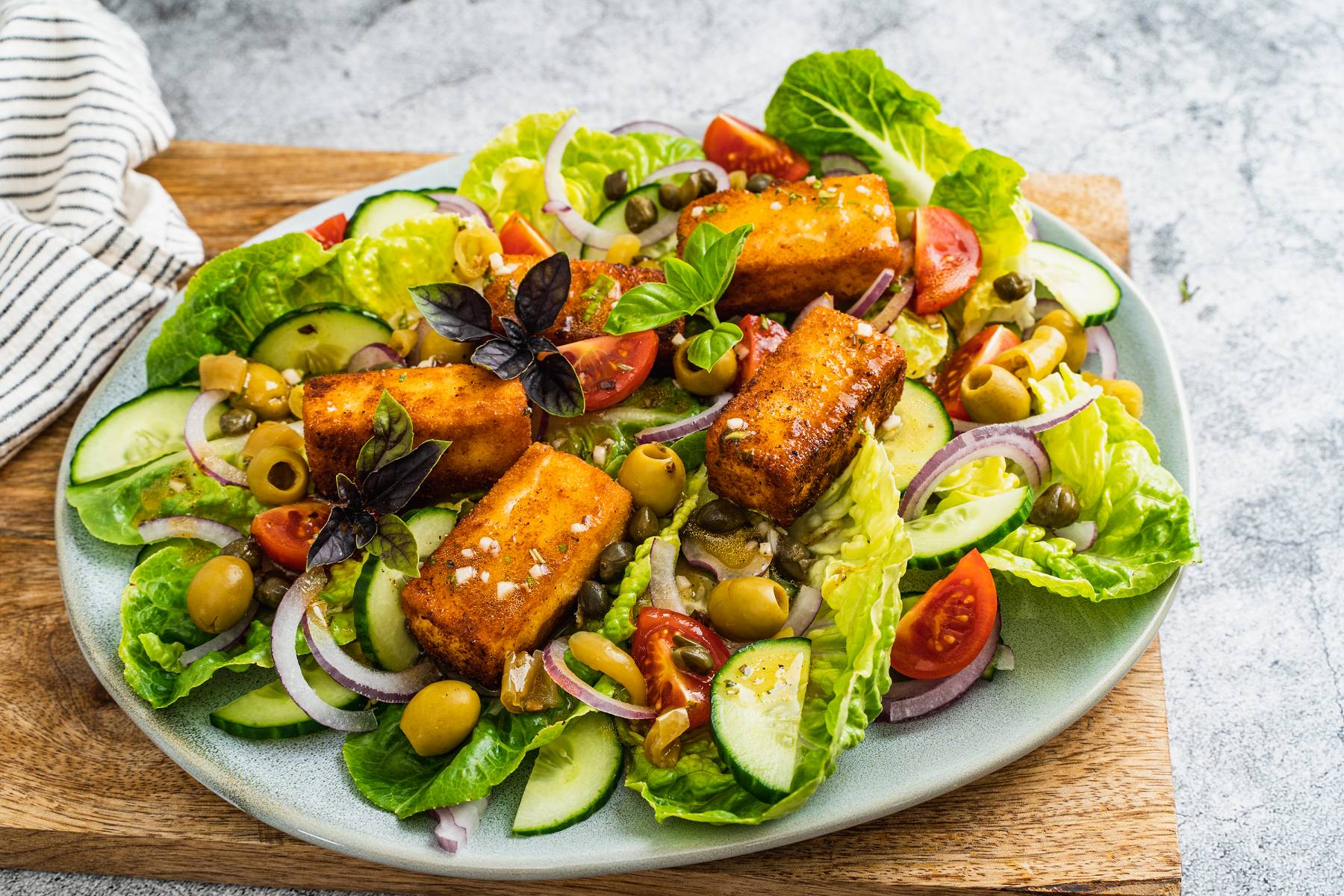 Eine beschichtete Pfanne mit ausreichend Olivenöl erhitzen und den Feta kurz auf jeder Seite braten, bis er knusprig gold-braun ist.