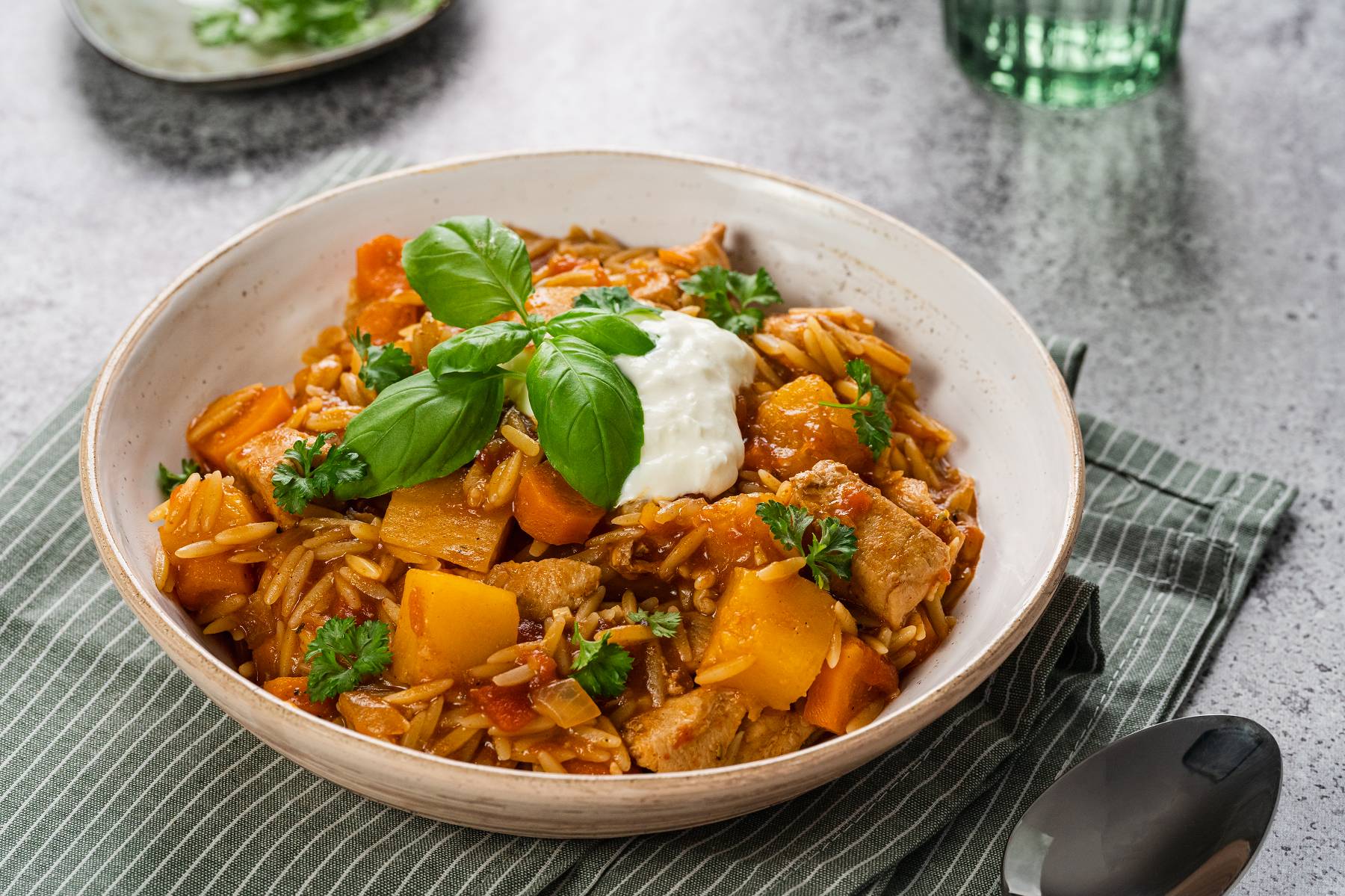 Eintopf abschmecken und mit Petersilie und Sauersahne servieren.