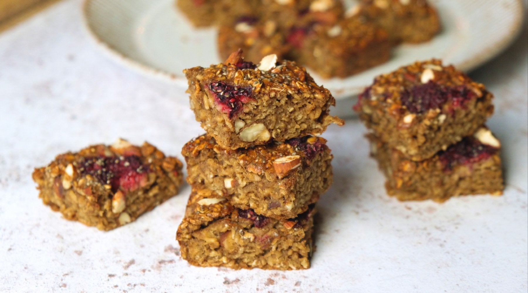 - Dekoriere die Frühstücksriegel mit gehackten Mandeln, Chiasamen und Himbeeren und backe das Ganze etwa 30 Minuten lang.