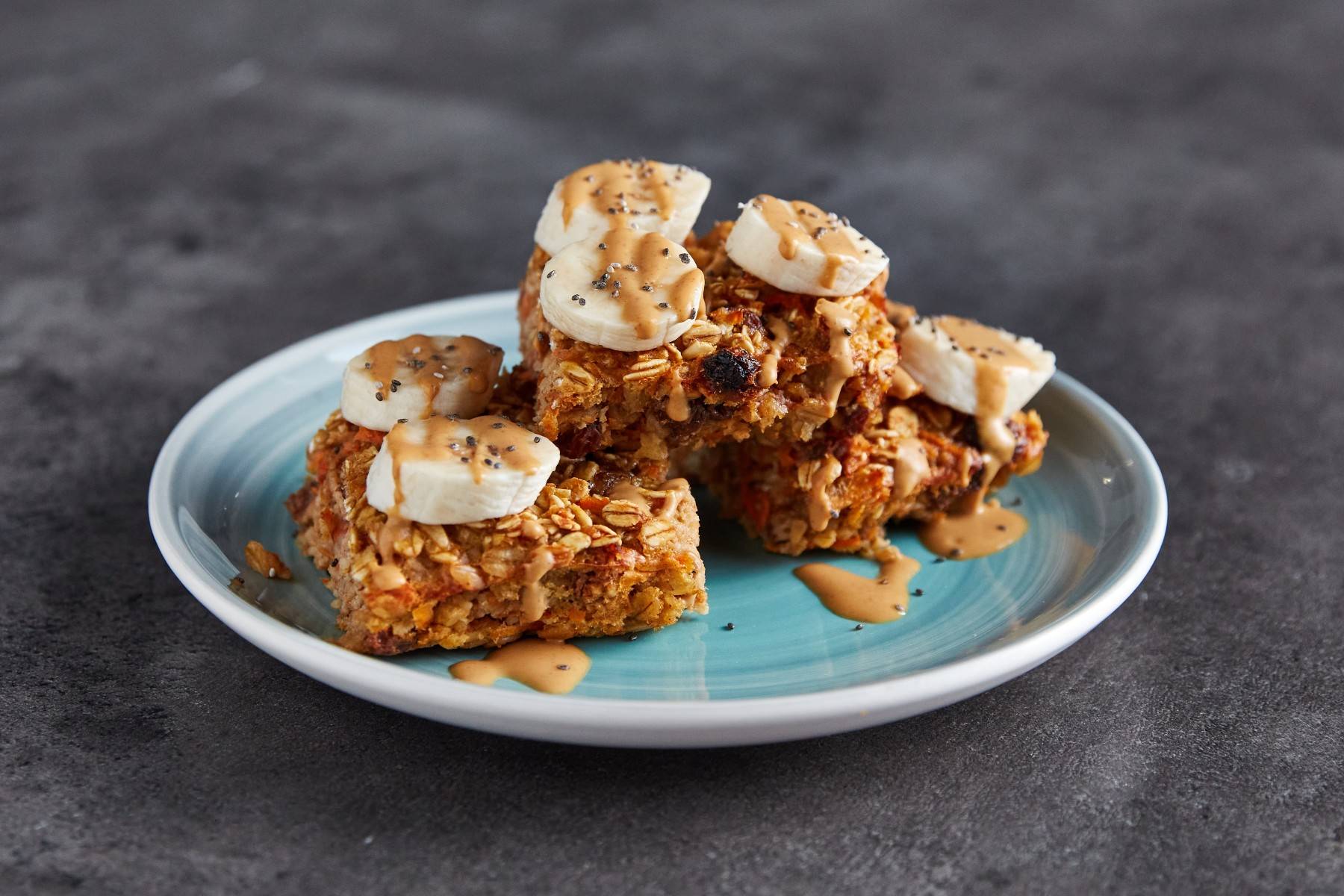 Nach dem Backen vorsichtig aus der Backform nehmen und einige Minuten abkühlen lassen, bevor sie in 9 gleichmäßige Quadrate geschnitten werden. In wiederverwendbaren Zip-Lock-Beuteln im Kühlschrank aufbewahren, um später in der Woche ein einfaches Frühstück zum Mitnehmen zu haben.
