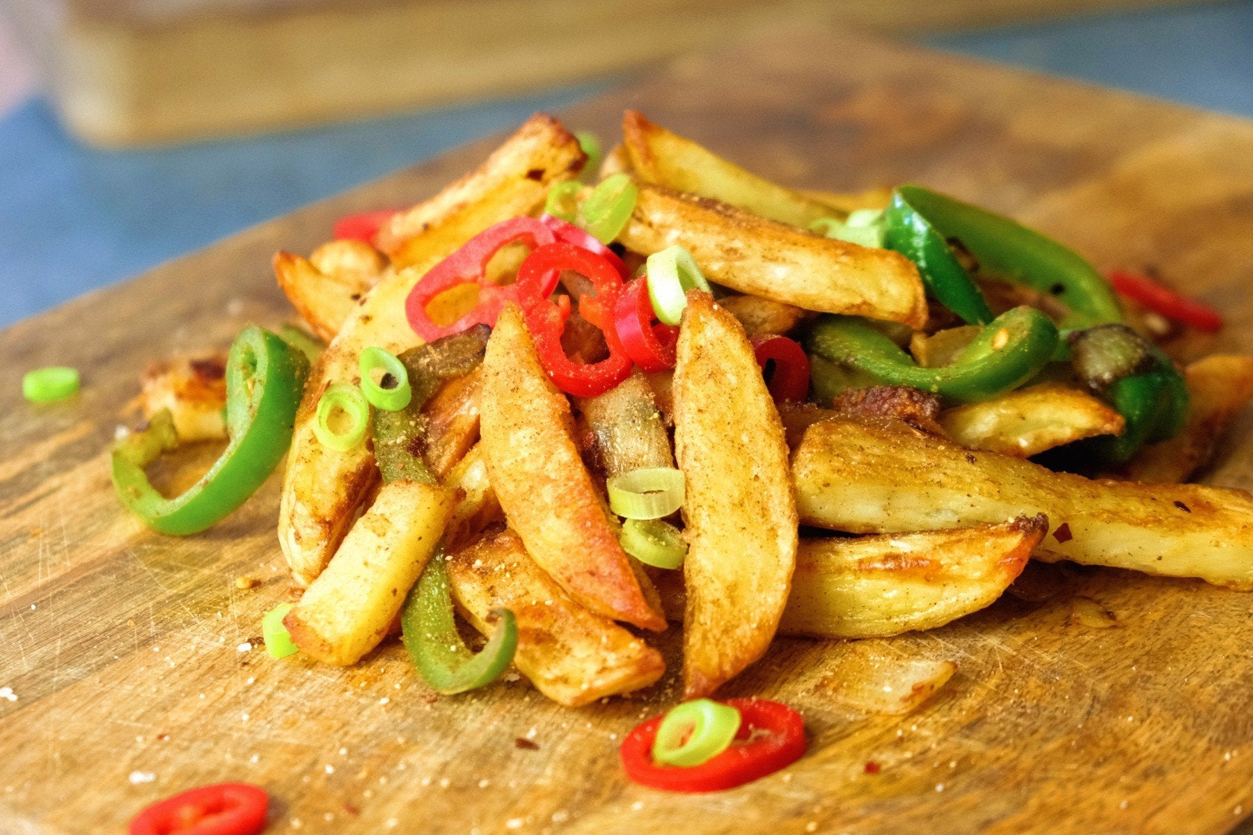 Sobald die Kartoffelspalten fertig sind, tupfst du das überschüssige Öl ab und gibst sie mit Zwiebel, Paprika und Chili in die Pfanne. Rühre alles gut um und füge dann 1-2 Teelöffel von der Gewürzmischung hinzu (es sollte noch etwas übrig bleiben für ein anderes Mal).