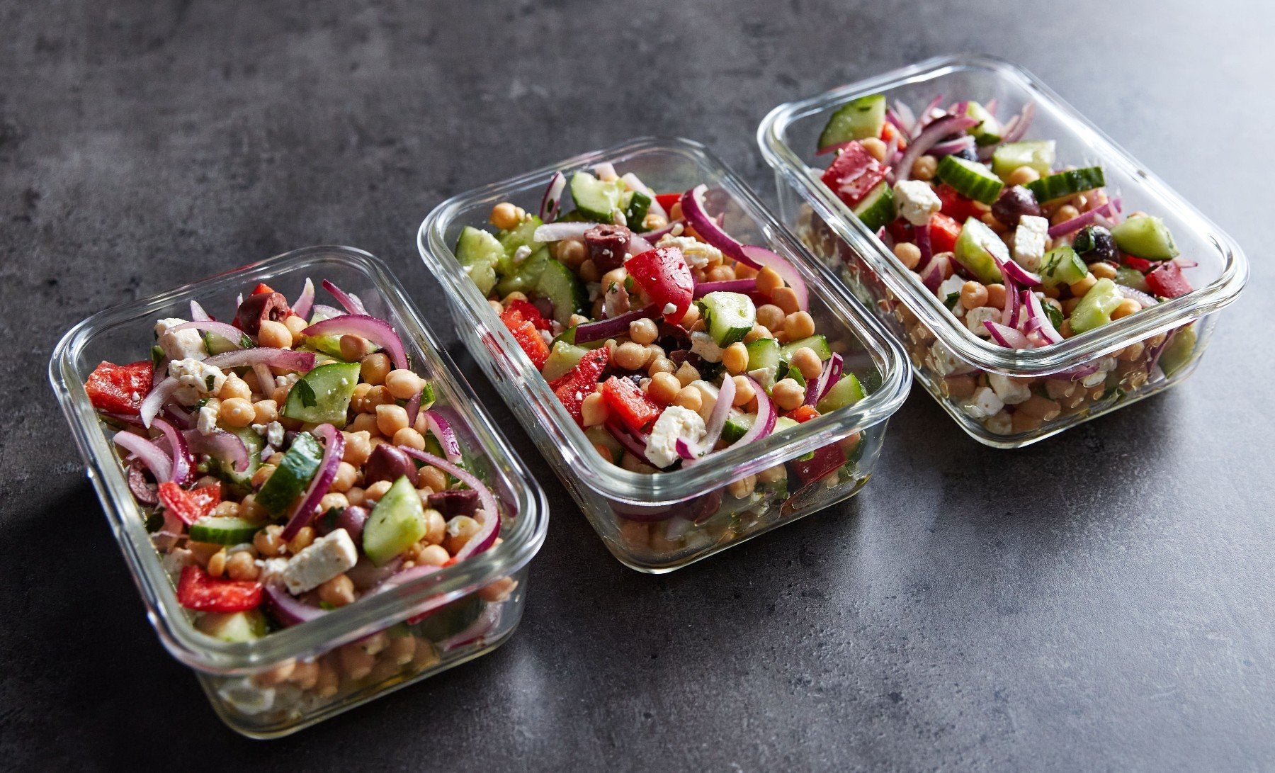 In einer großen Schüssel die abgetropften Kichererbsen, die gehackte Gurke, die rote Paprika, die rote Zwiebel, die halbierten Oliven und den zerbröckelten Feta mischen.