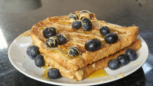 Die logische Weiterentwicklung des French Toast mit Erdnussbutter-Füllung ist ein French Toast mit Erdnussbutter und Marmelade, also die klassische „Peanut Butter-Jelly“-Kombination.