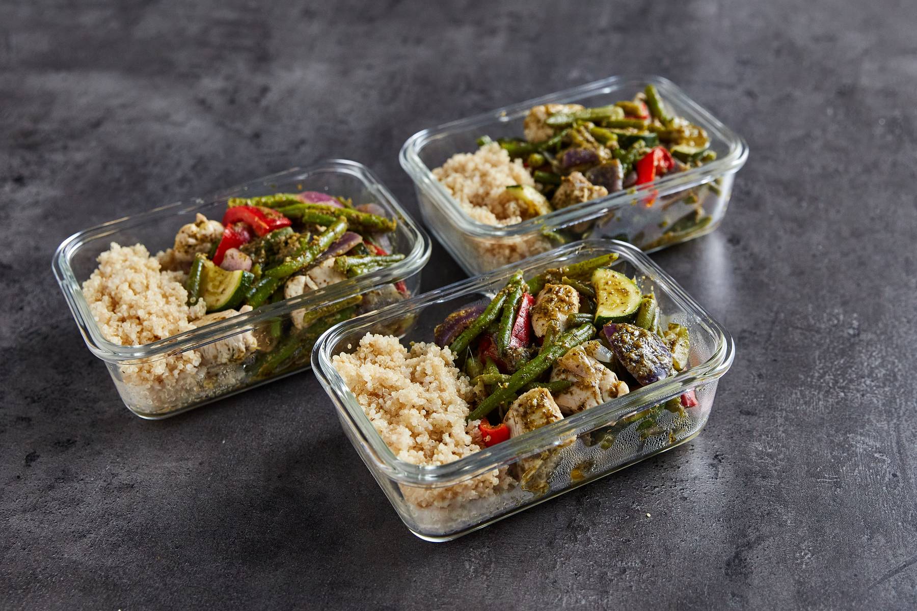 Versuche es mit dieser Meal Prep, um deine Ernährung für die nachfolgenden Tage vorzubereiten. Schneide einfach etwas Hähnchenfleisch und eine Ladung Gemüse klein - und schon kann es losgehen. Genieße das Pesto-Hähnchen ohne Kohlenhydratbeilage als Keto-Variante oder serviere es mit einer Portion Quinoa, wenn du eine Portion Kohlenhydrate vertragen kannst.