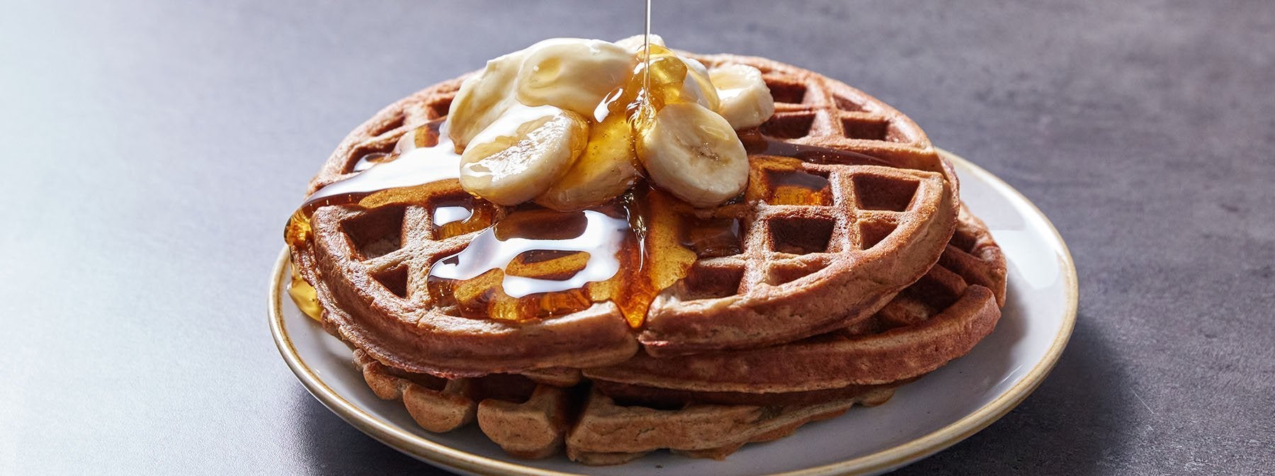 - Belege die Waffeln mit deinen Lieblings-Toppings - wir haben uns für einen Klecks griechischen Joghurt, geschnittene Banane und reichlich zuckerfreien Sirup entschieden.