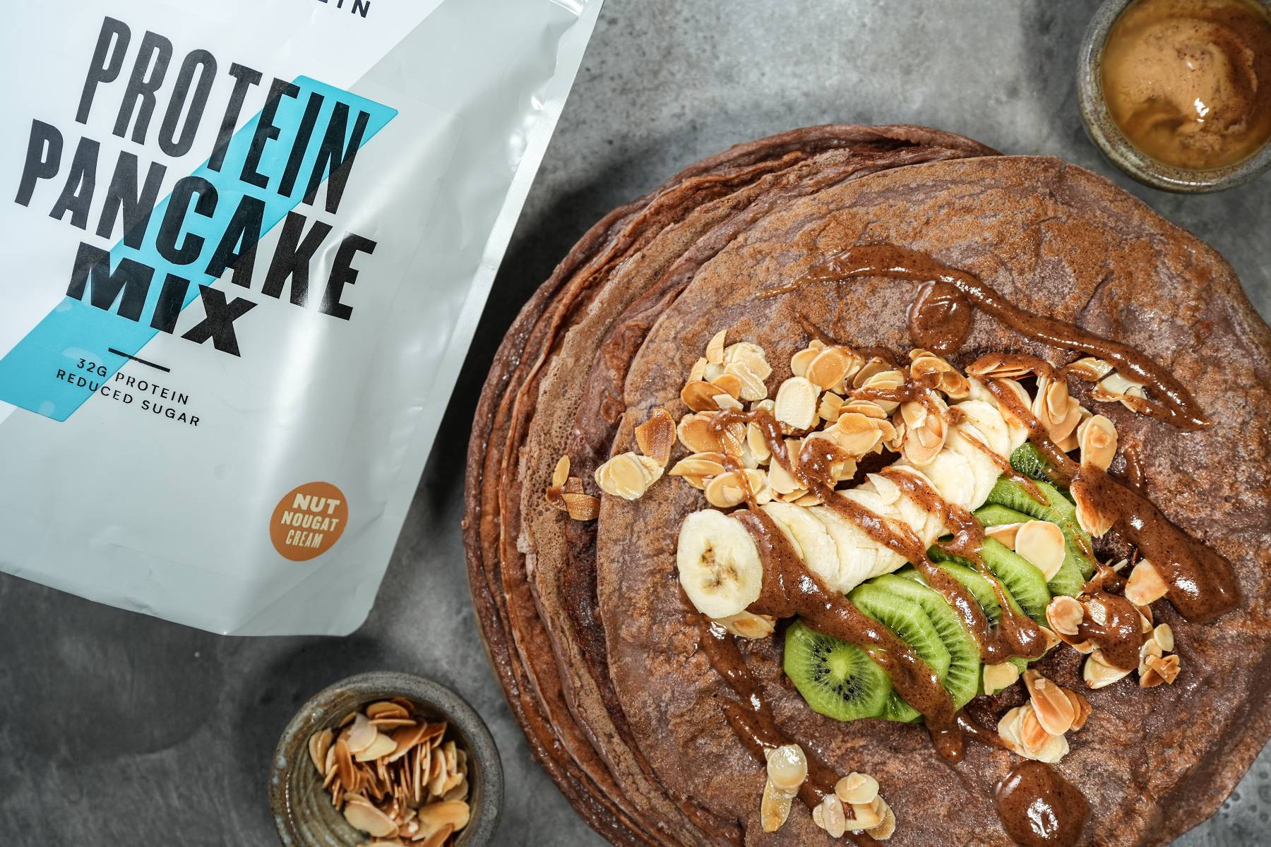 beidseitig.Schäle und schneide eine Kiwi und Bananen und dekoriere deine Nuss Nougat Protein Pancakes mit angebratenen Mandelplättchen und der Mandelbutter. Fertig!