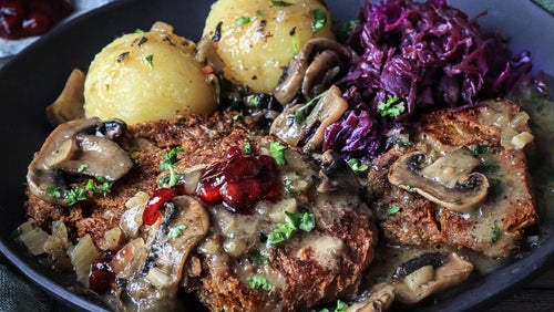 Soja-Medaillons in Pilzrahmsoße mit Preiselbeeren | Meal Prep Rezept