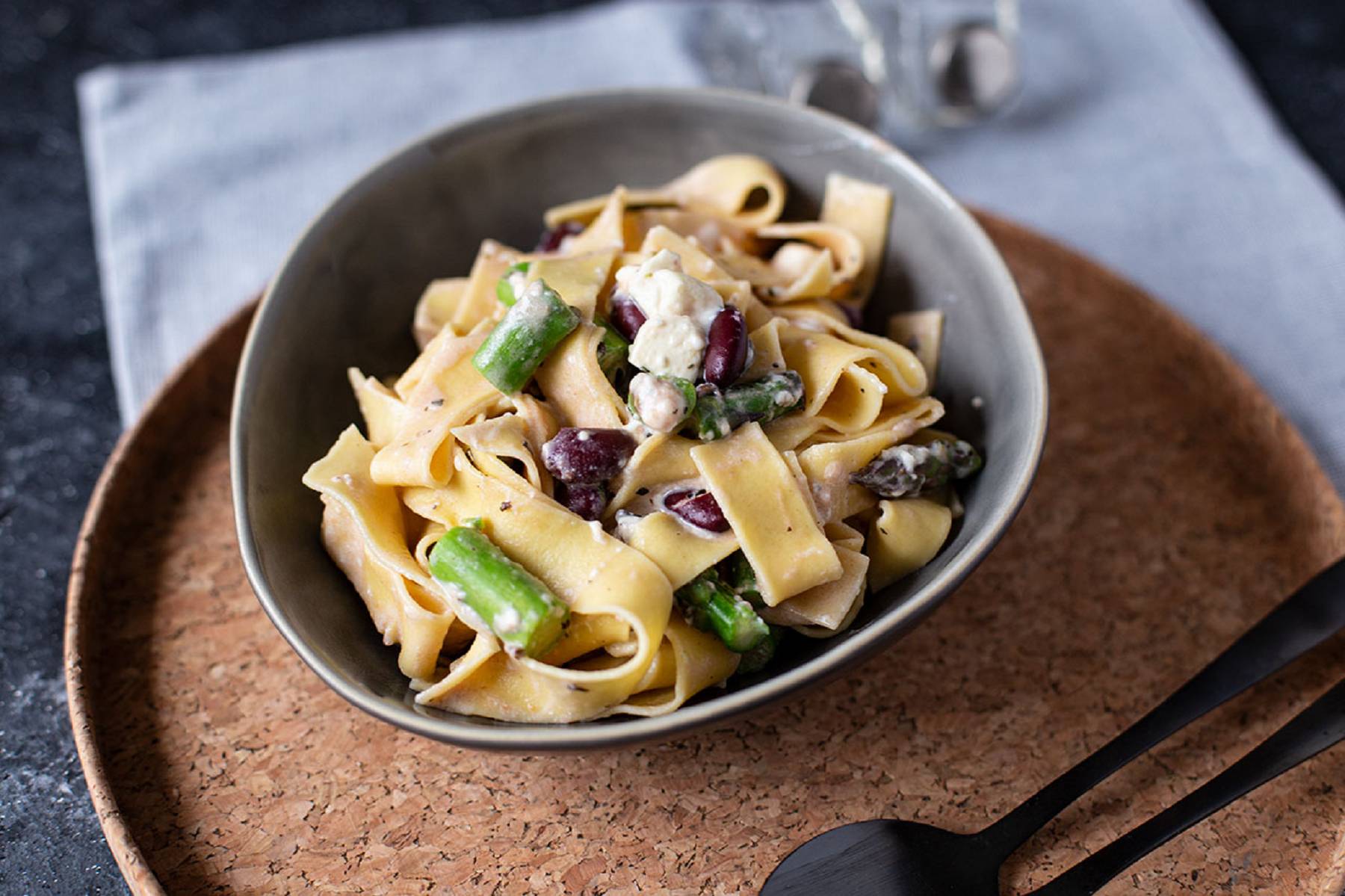 So auch bei diesem Gericht: Bandnudeln in einer leicht cremigen Soße aus Frischkäse und Feta, dazu eben grüner Spargel und Kidneybohnen.