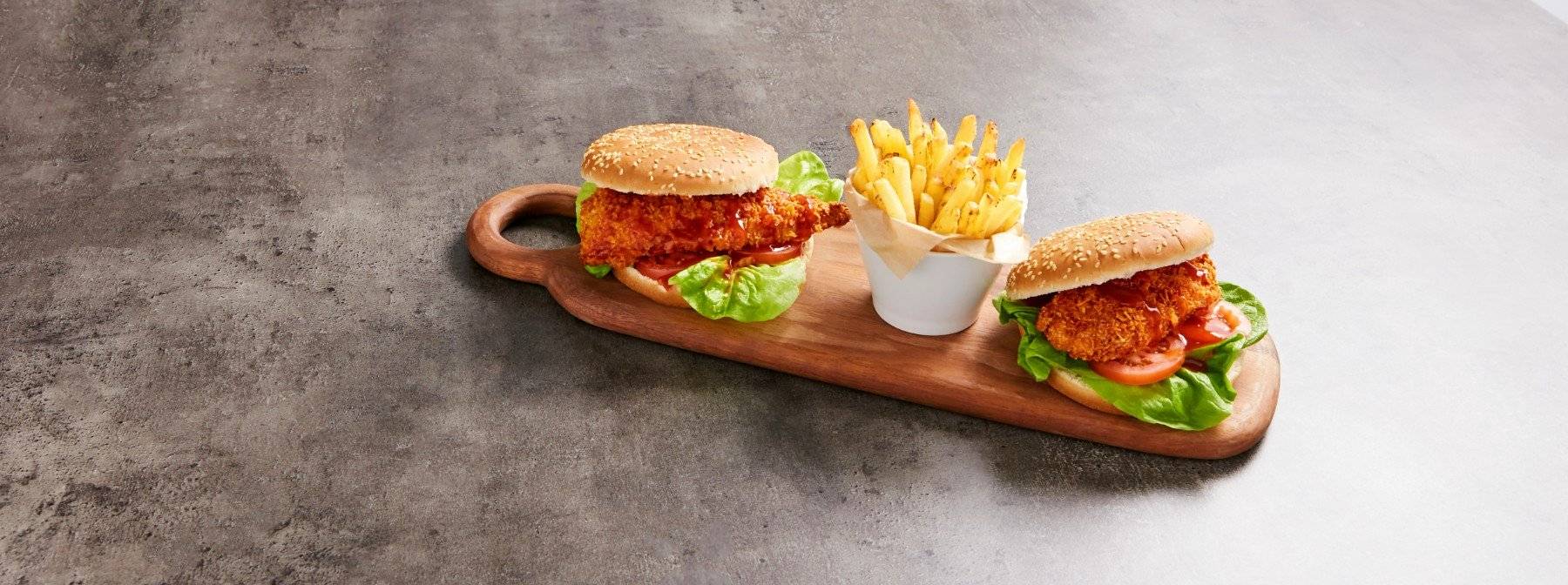 - Wenn die pikanten Hähnchenbrustfilets vollständig gegart sind und goldfarben werden, kannst du sie auf die Tomaten und den Salat legen. Dann noch einen Spritzer Peri-Peri-Sauce oder zuckerarmen Ketchup dazugeben und den Burger mit der Oberseite des Brötchens vervollständigen.