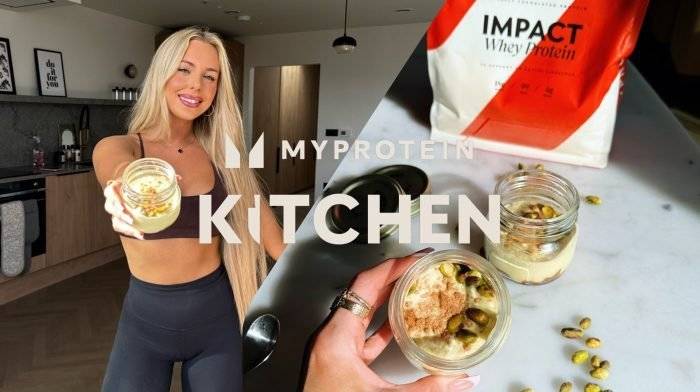 Gieße nun den Protein-Creme-Mix auf die Keks-Basis und verteile alles sorgfältig mit dem Löffel (alles glatt verstreichen). Toppe das Ganze mit ein paar zerstoßenen Pistazien.