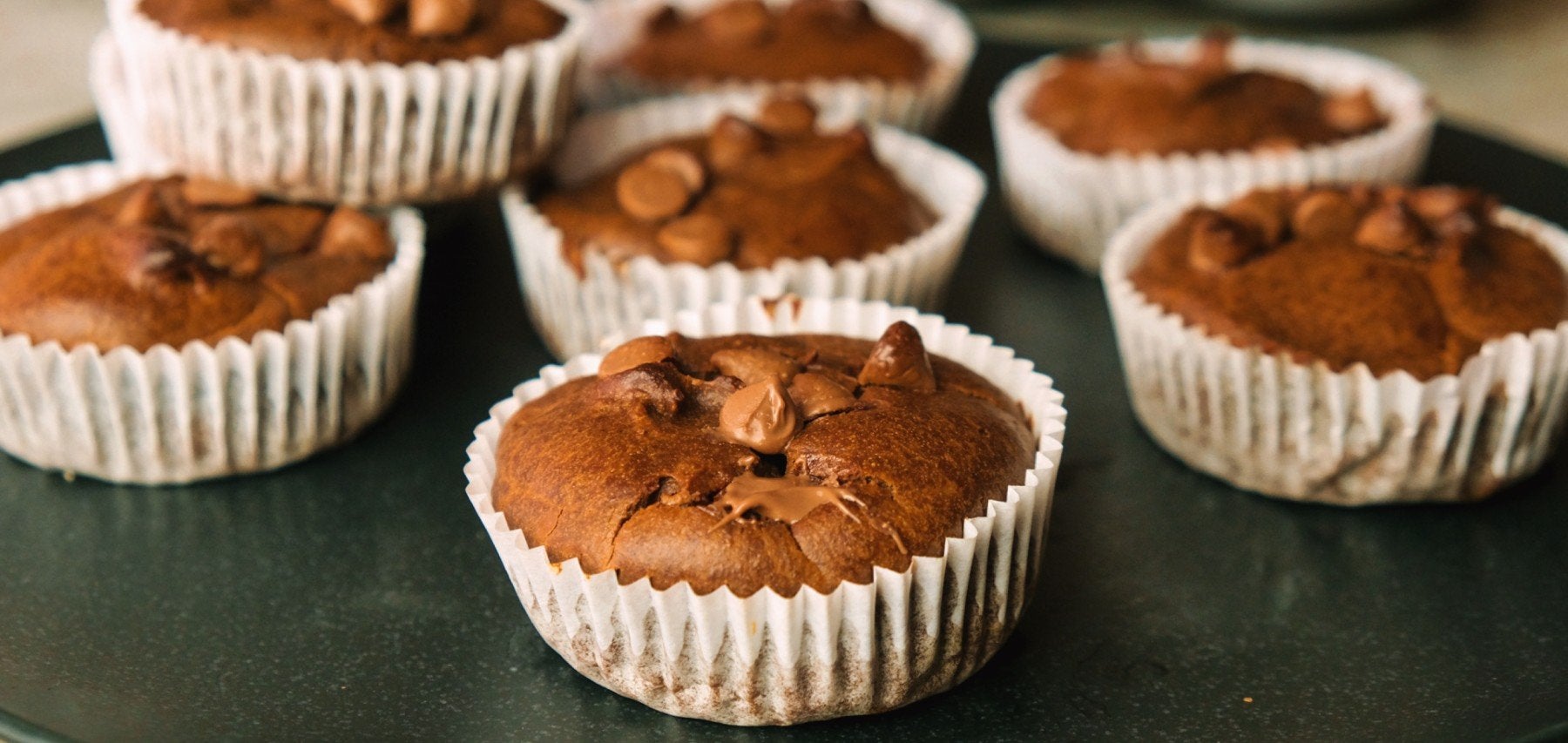 Backen Die Protein Brownie Muffins für 12-15 Minuten (steche sie mit einem Zahnstocher ein und wenn diese sauber wieder herauskommen, dann sind die Muffins fertig).