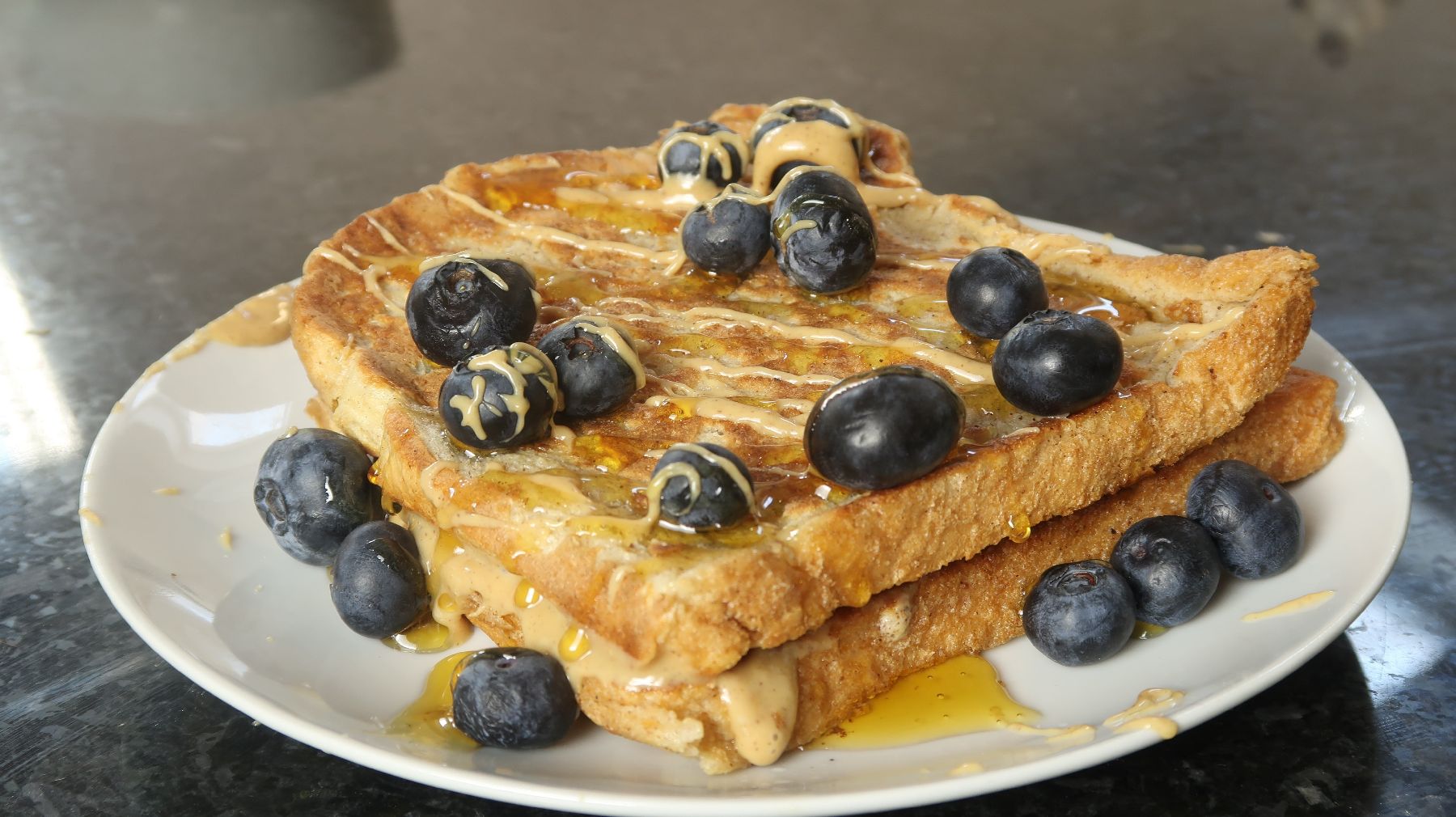 - Sobald eine Scheibe durchgebraten ist, holst du sie aus der Pfanne und verteilst etwas Erdnussbutter auf deinem Protein French Toast. Vergiss nicht, ihn mit Blaubeeren als Topping zu veredeln.