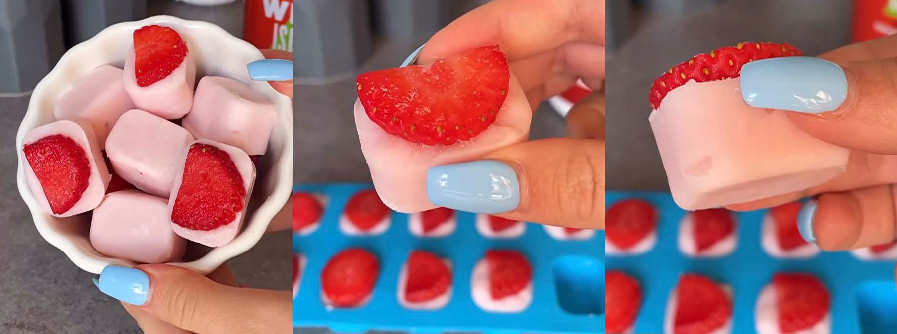 Verteile den Mix gleichmäßig in einer Eiswürfelform und garniere das Ganze mit frischen Erdbeerscheiben.