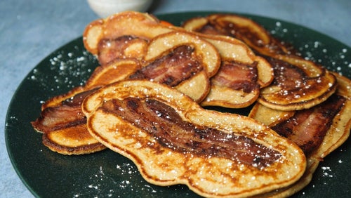 Mit Pancakes liegst du immer richtig, insbesondere dann, wenn man sie auch eindippen kann. Dazu gibt es noch eine Scheibe Speck – das perfekte Frühstück für den Sonntag.
