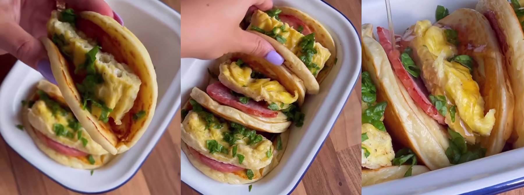 Falte die Pfannkuchen zu Tacos und lege diese auf einen Teller. Fülle die Frühstücks-Tacos nun mit dem Speck, dem Rührei und fein gehacktem Spinat.