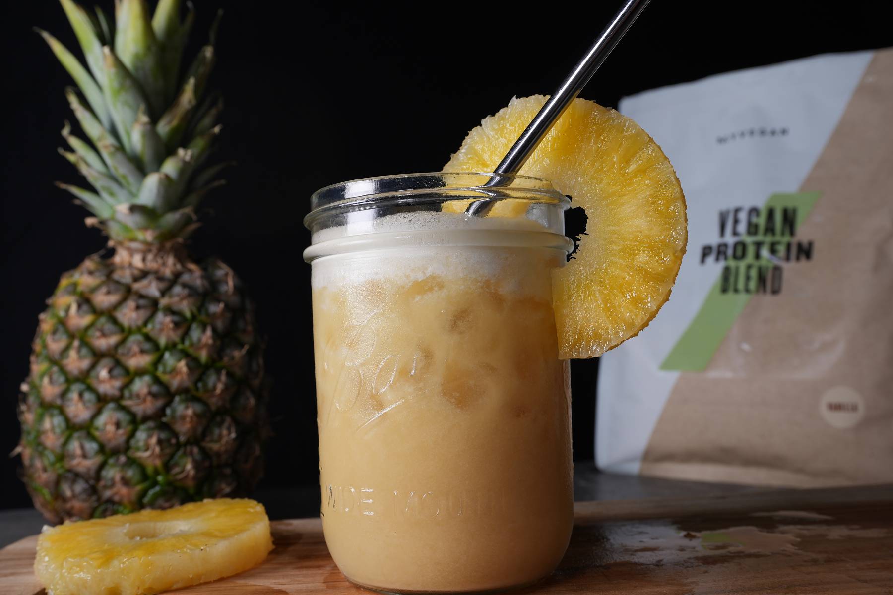 Dekoriere deine proteinreiche Pina Colada abschließend mit frischer Ananas und Kokosraspeln.