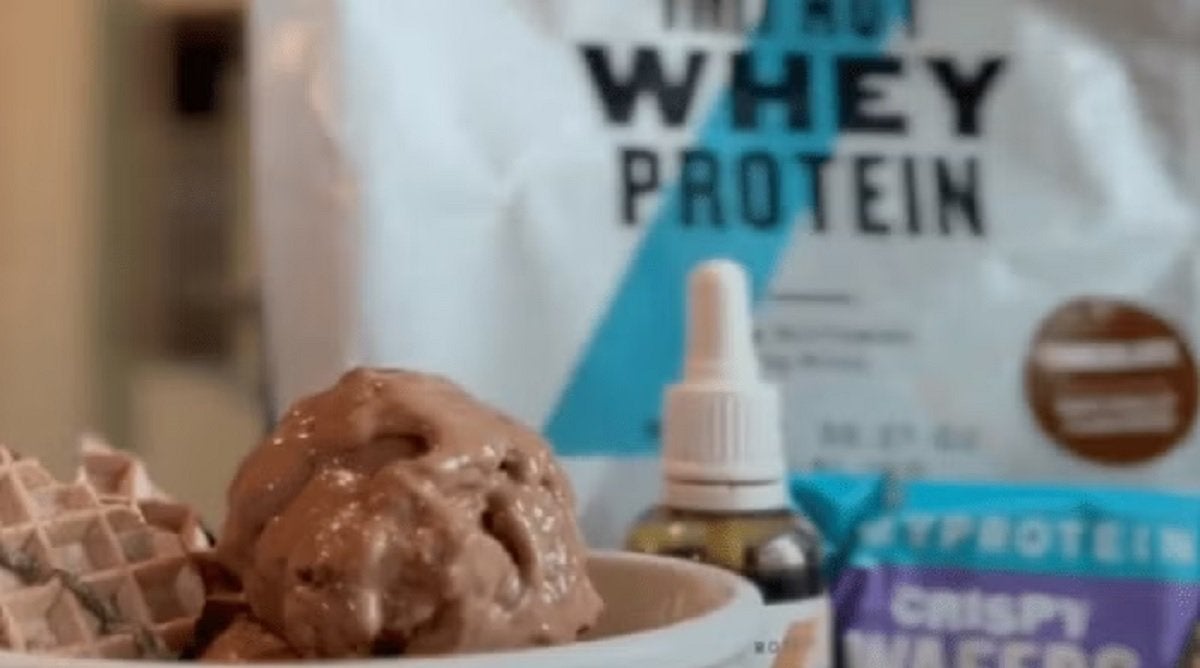 Toppe das Eis, sobald du es serviert hast, mit der anderen Hälfte der Protein-Waffel und genieße!