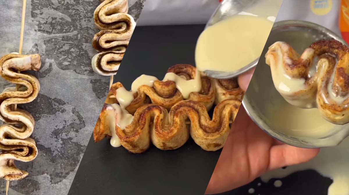 - Schneide den Teig in vier gleich lange Abschnitte und lege die äußeren Abschnitte wieder auf die inneren Abschnitte, so dass zwei Zimtrollen-Sandwiches“ entstehen.