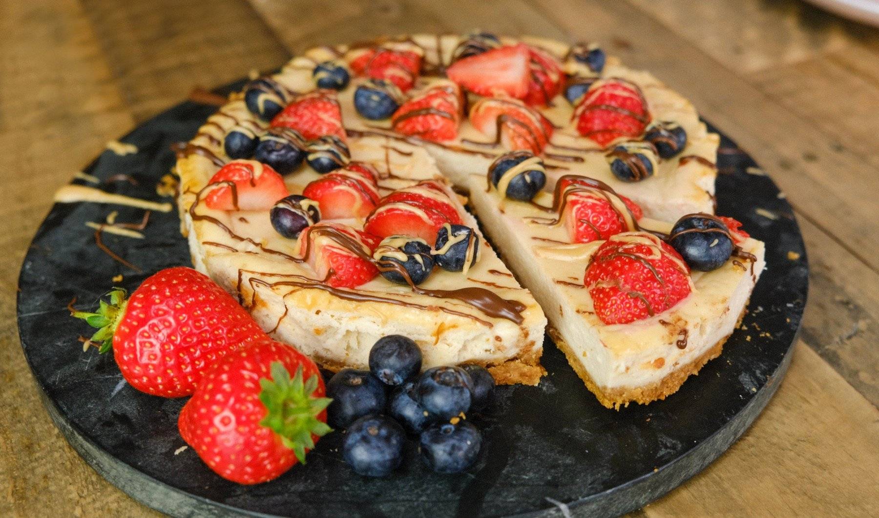- Nachdem der Erdnussbutter Käsekuchen vollständig abgekühlt ist, kannst du ihn mit deinen Lieblings-Toppings dekorieren. Wir haben reichlich geschmolzene Erdnussbutter und den Proteinaufstrich in Schokolade-Haselnuss verwendet und mit Erd- und Blaubeeren abgerundet.