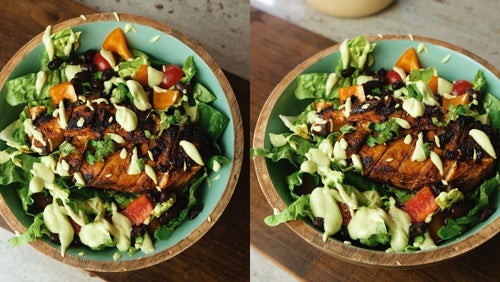 Dieser Salat kommt mit einem unglaublich leckeren Avocado-Dressing. Er ist so gut, dass er vielleicht sogar dem Mozzarella-Burger die Schau stehlen könnte. Um dem ganzen noch einen draufzusetzen, grillst du dein Hähnchen auf dem Grill.
