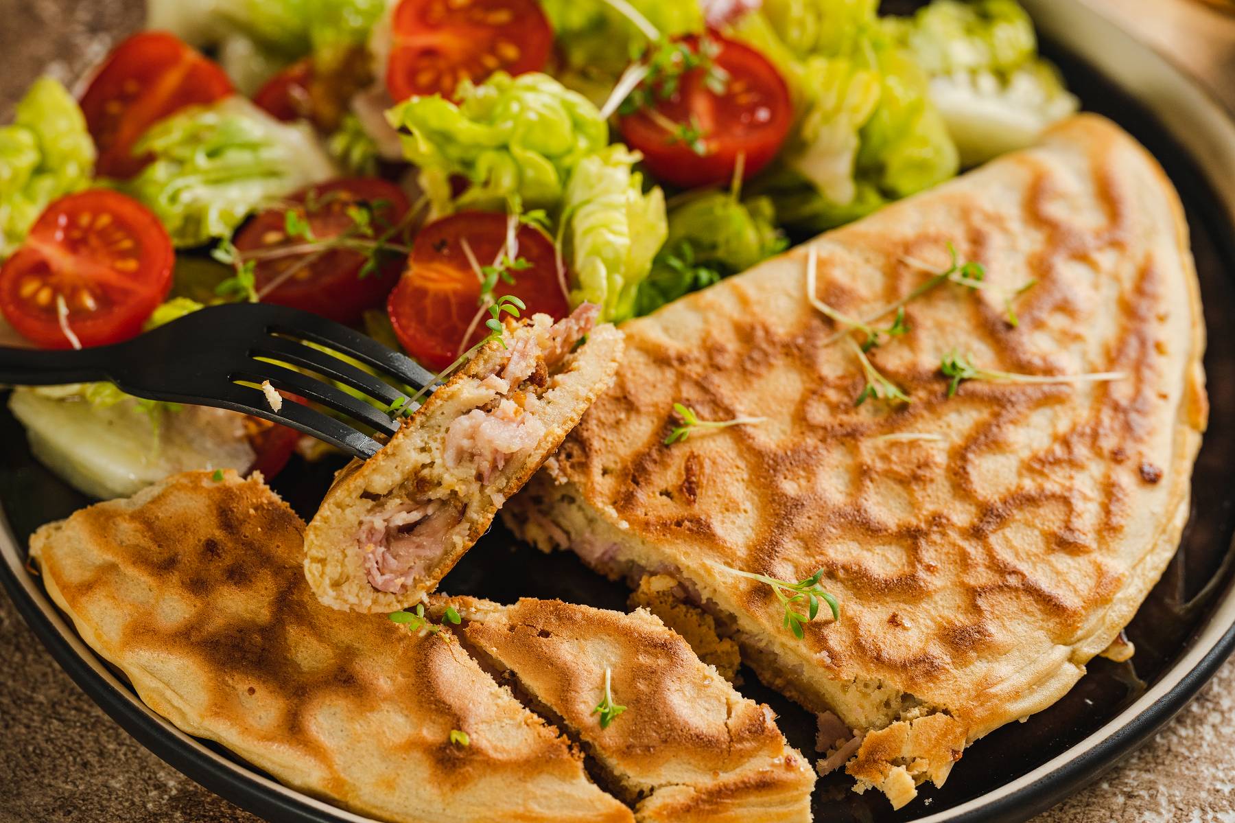 Bei mittlerer Hitze für 2,5 Minuten backen lassen. Der Pancake einklappen und für eine weitere Minute bei geschlossenem Deckel braten lassen.