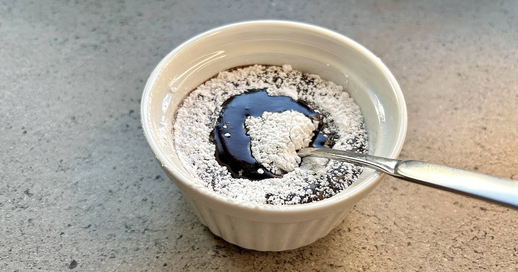 Verrühre alles anschließend mit einem Schneebesen zu einer cremigen Schoko-Masse und verteile diese im nächsten Schritt auf zwei (ofenfeste) Schälchen.