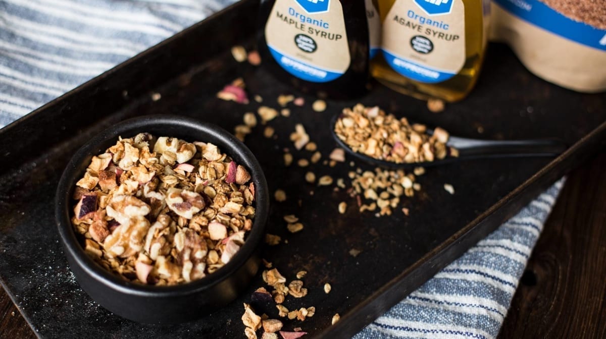 50g Walnüsse, gehackt 100ml Kokosöl, geschmolzen 125ml Ahorn Sirup oder Manuka-Honig - 50g Trockenobst eurer Wahl (hier Apfel)