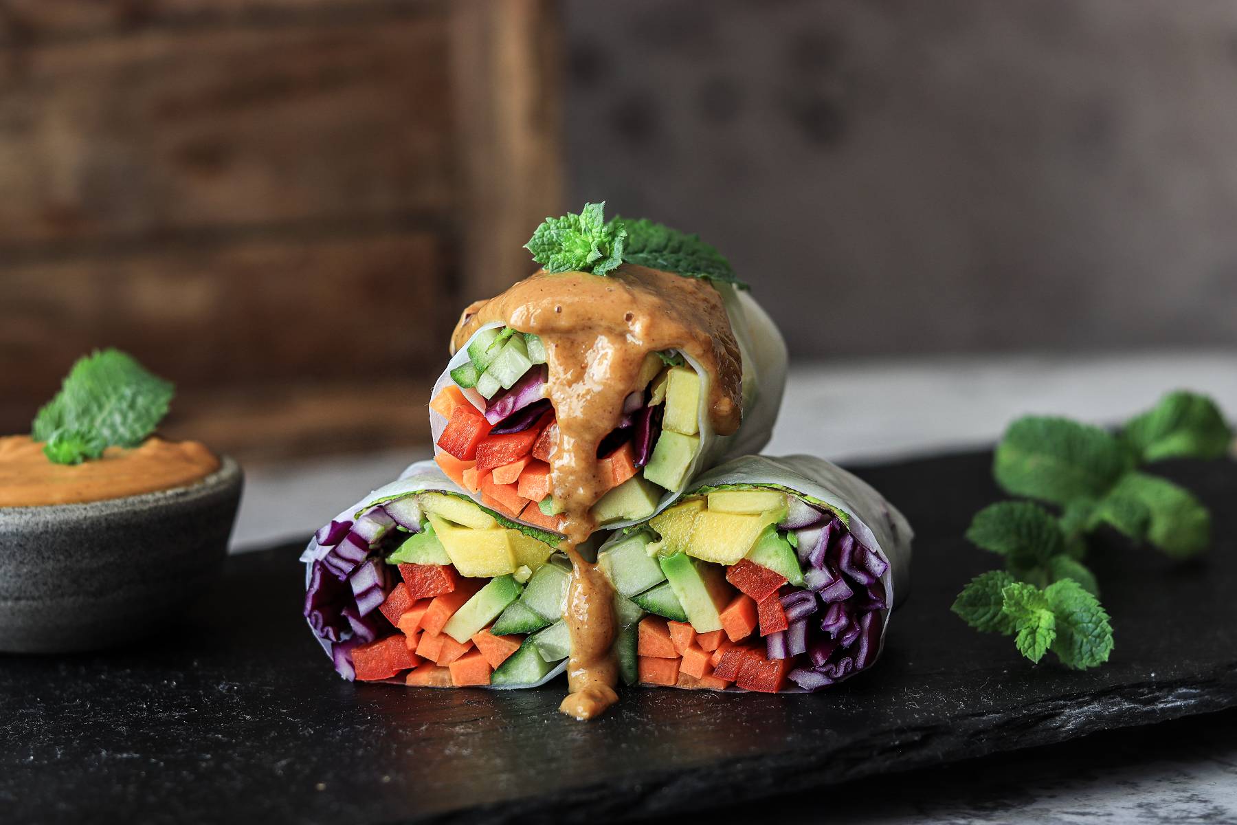 Schichte die Zutaten für die Füllung mittig. Falte die lange Seite über die Füllung und klappe die Seiten darüber. Nun rollst du den Rest zusammen und halbierst die Sommerrolle mit einem Messer