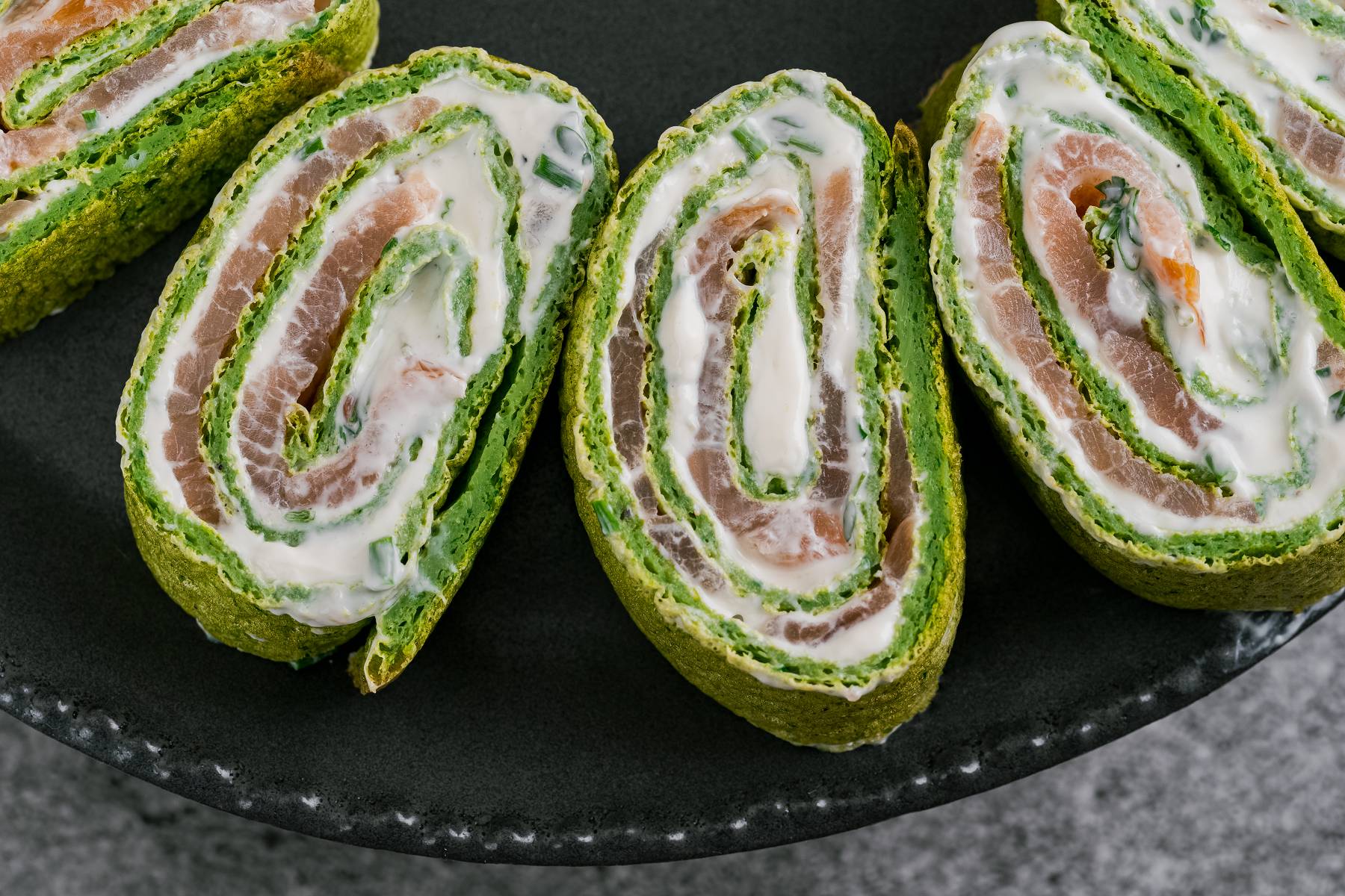 Omelett wieder entrollen. Frischkäsecreme darauf verstreichen, dabei rundherum einen ca. 1 cm breiten Rand frei lassen. Lachs, Schnittlauch und Kresse darauf verteilen. Omelett wieder aufrollen, ca. 30 Minuten kaltstellen.
