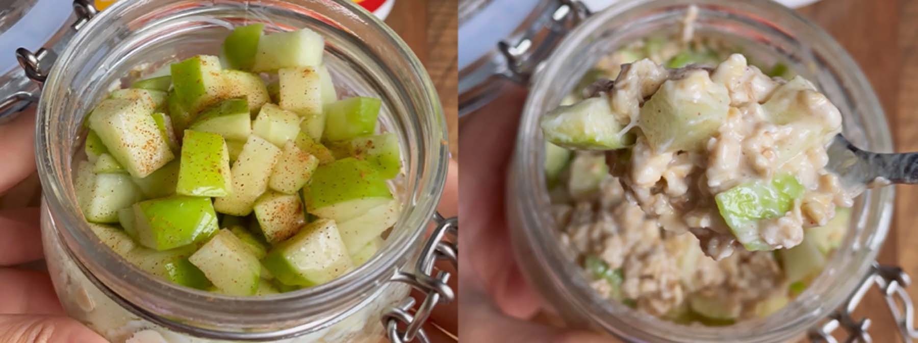 Am Morgen (oder wann immer du die Overnight Oats essen möchtest) aus dem Kühlschrank nehmen und mit Apfelwürfeln, etwas Zimt und einem Spritzer zuckerfreiem Sirup garnieren. Guten Appetit!