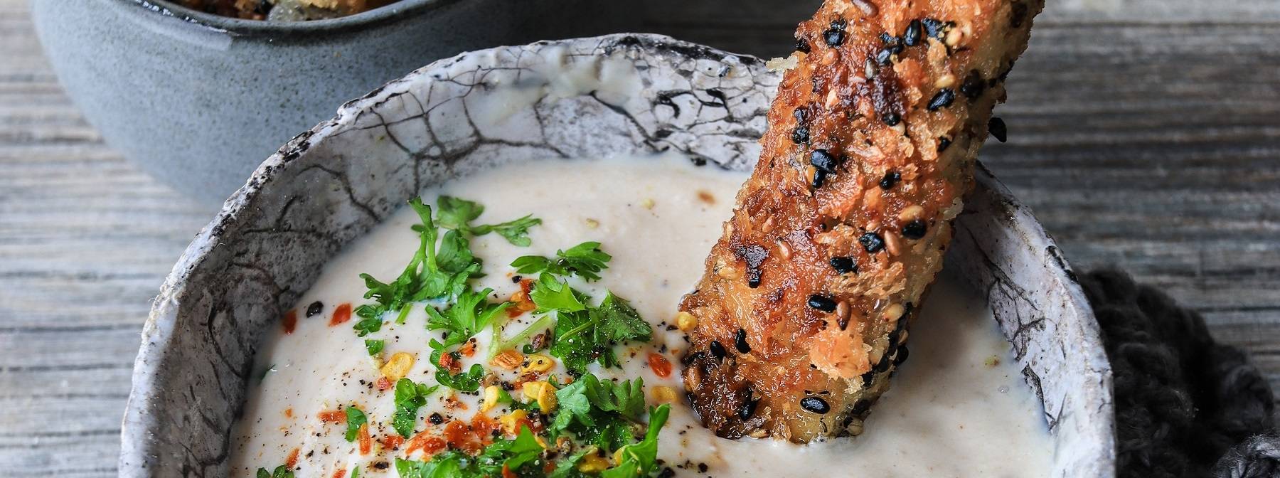In einer zweiten Schüssel vermengst du das Paniermehl und Sesam.