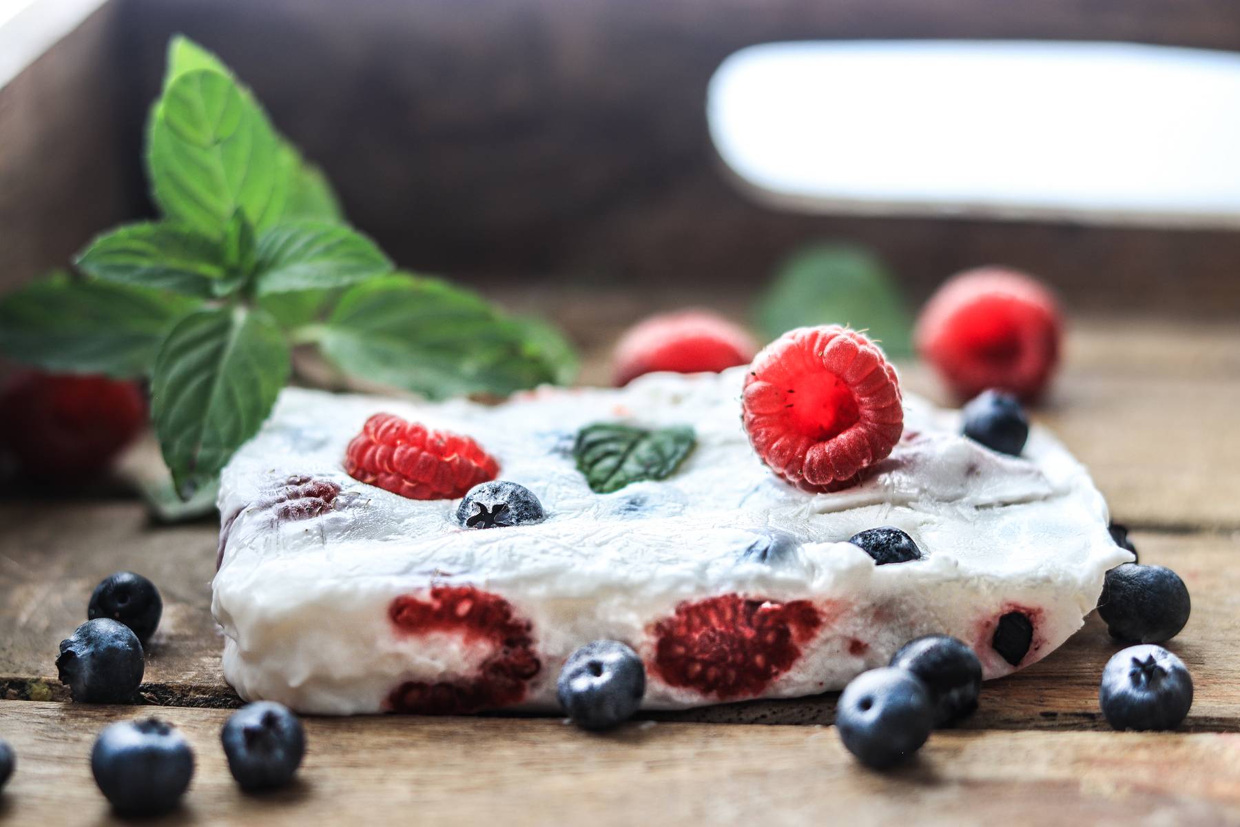 Lege für die Optik noch ein paar einzelne Beeren in die Masse und vergiss die Minzblätter nicht.