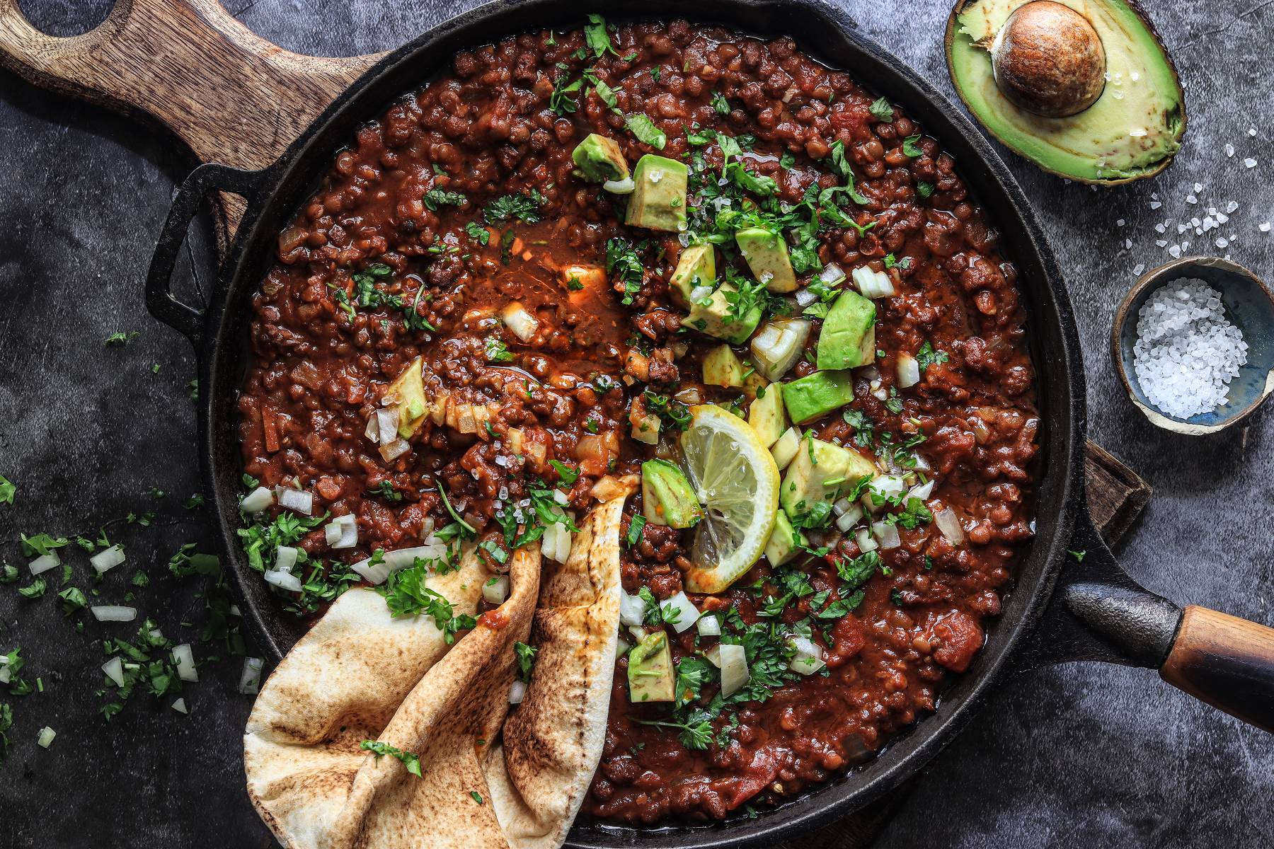 Gib die Linsen hinzu und köchle alles auf kleiner Flamme für 10-15 Minuten. Schmecke das Ganze mit Salz und Pfeffer ab.