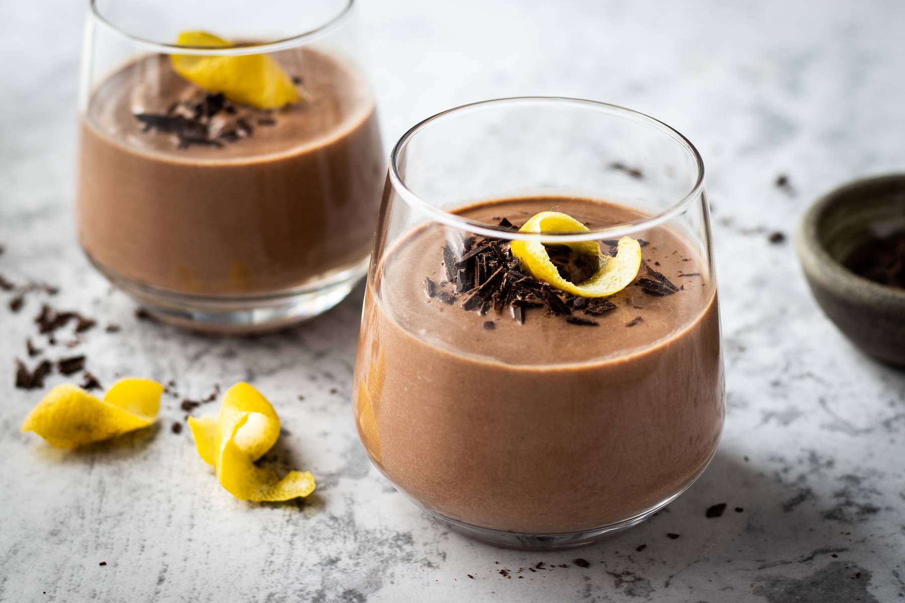 Fülle das Mousse in ein Dessert-Glas und dekoriere es mit einer Zitronenschale.
