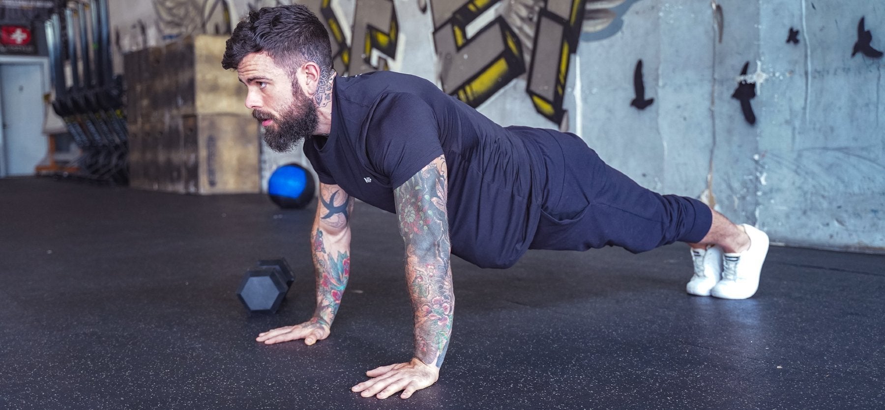 Bringe dich in die Plank-Position und beginne den Press Up entweder, indem du dich in die vollständige Liegestütz-Position bringst oder auf den Knien abstützt, wenn du keinen vollständigen Liegestütz hinbekommst. Sobald Brust und Hüften Kontakt mit dem Boden haben, hältst du inne, bevor du dich vom Boden wieder hochdrückst.
