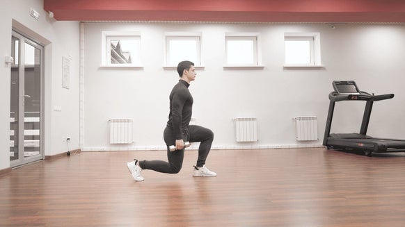 - Mache mit deinem linken Bein einen Schritt nach hinten und beuge dein Knie, sodass es sich in Richtung Boden bewegt. Unten angekommen, drückst du dich mit beiden Beinen wieder zurück nach oben in die Ausgangsposition und wiederholst den Bewegungsablauf anschließend mit demselben Bein. Führe beliebig viele Wiederholungen aus, bevor du die Kettlebell auf der anderen Schulter ablegst und das Bein wechselst.